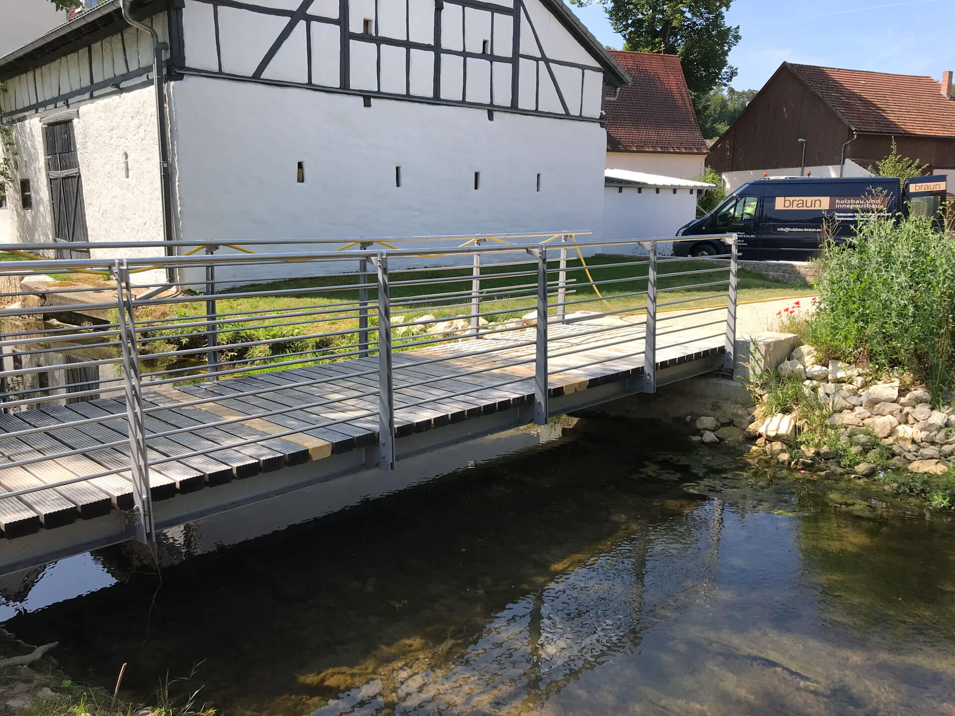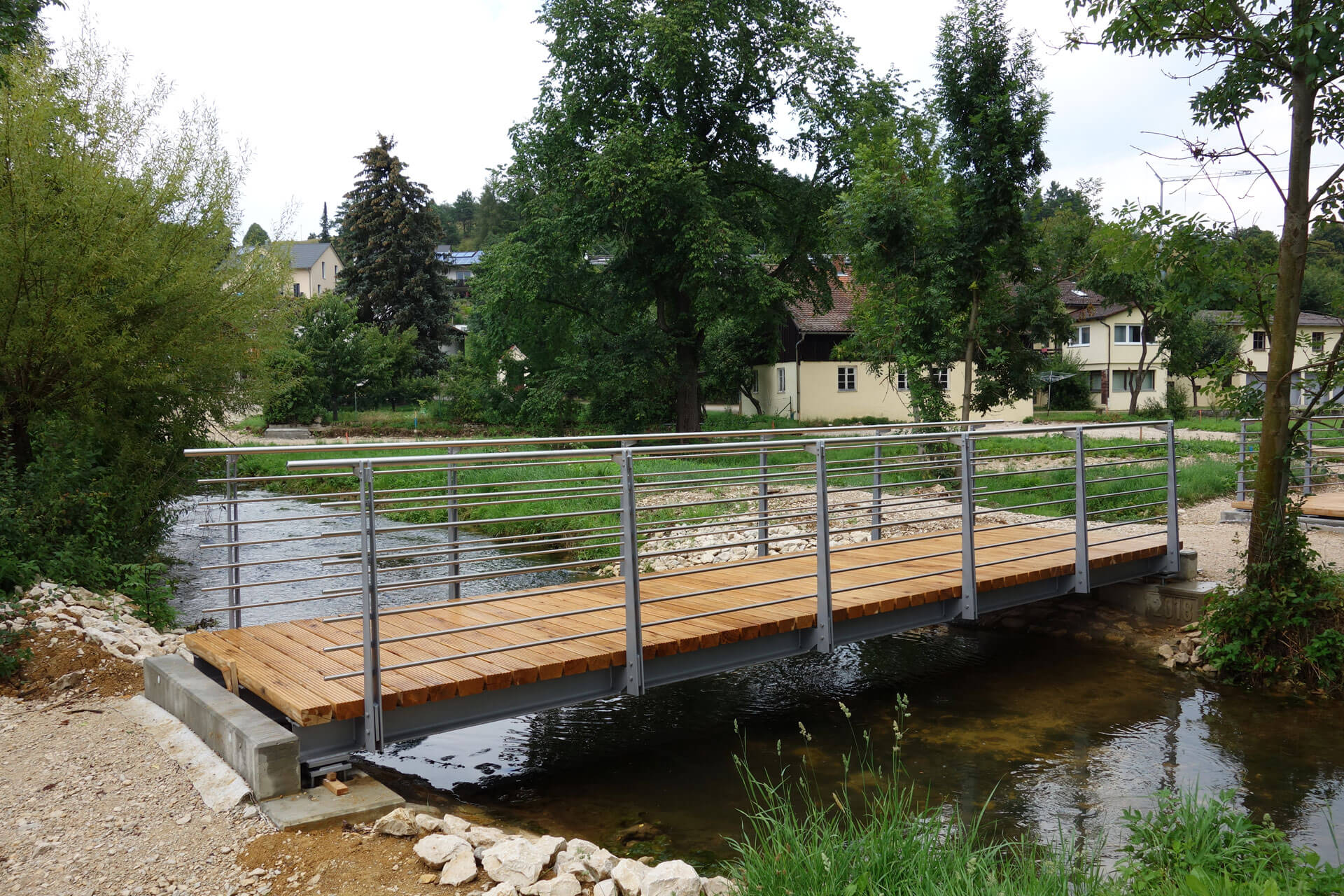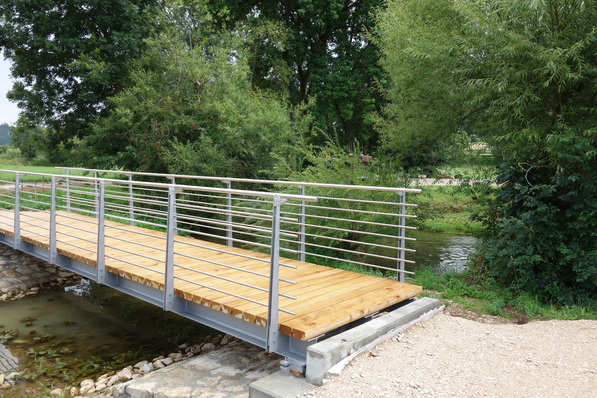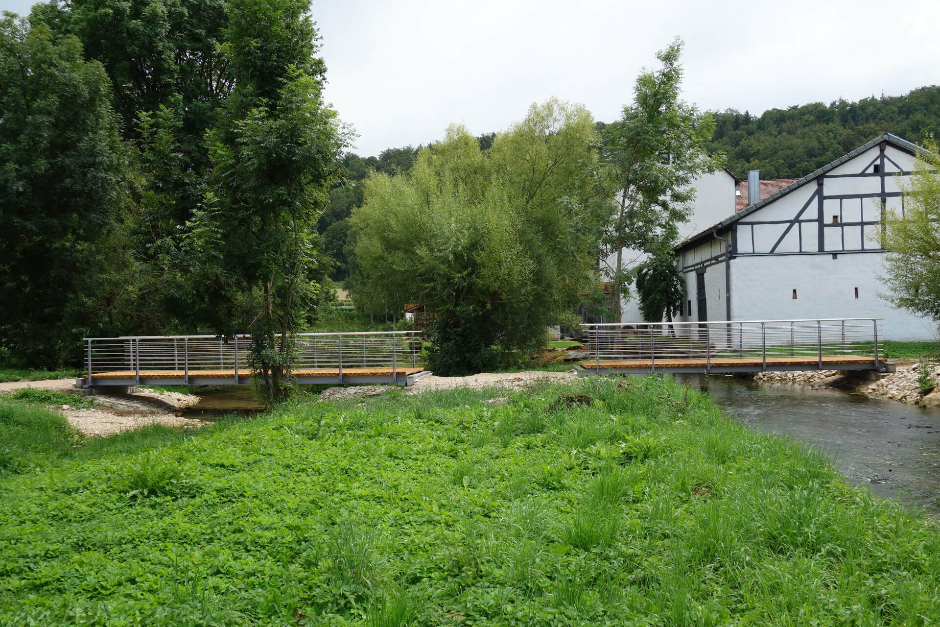 Um Einheimischen und Touristen einen guten Zugang zu ermöglichen, errichtete MTS zwei Fußgängerbrücken über den Altarm und den Werkkanal des Flüsschens Anlauter. Beide Bauwerke mit Spannweiten von acht und zehn Metern bestehen aus einem überhöhten Stahlprofiltragwerk mit Edelstahlgeländer. Beide Brücken wurden inklusive Massiveichendielen komplett von MTS gefertigt, vormontiert und in einem Hub auf der Baustelle eingehoben.