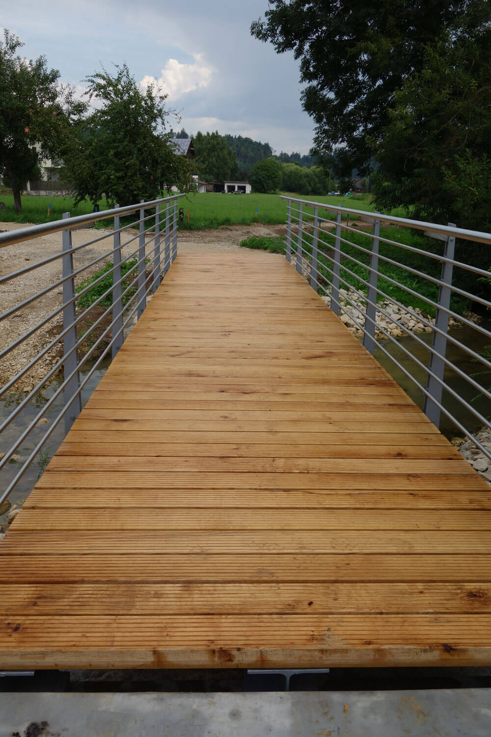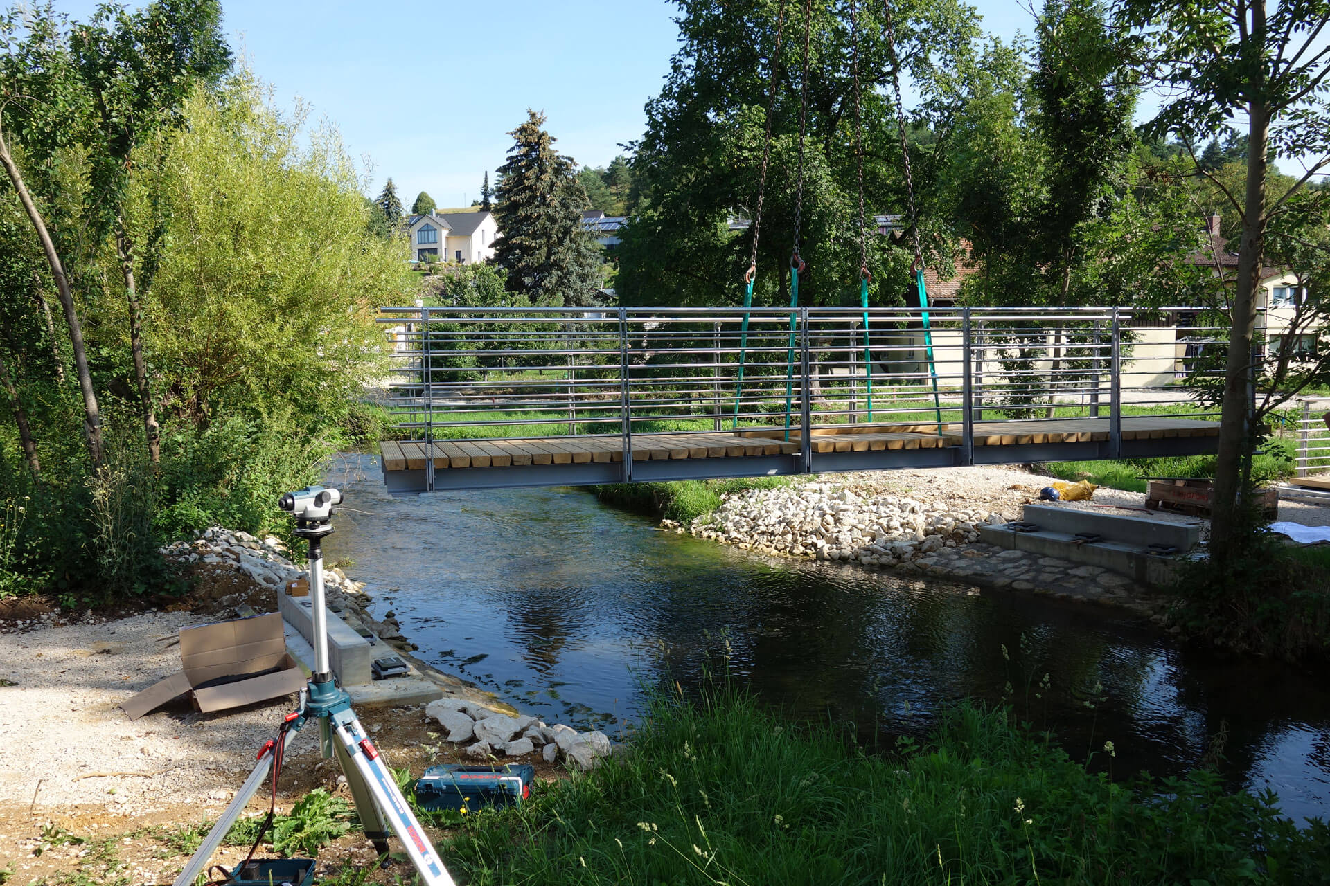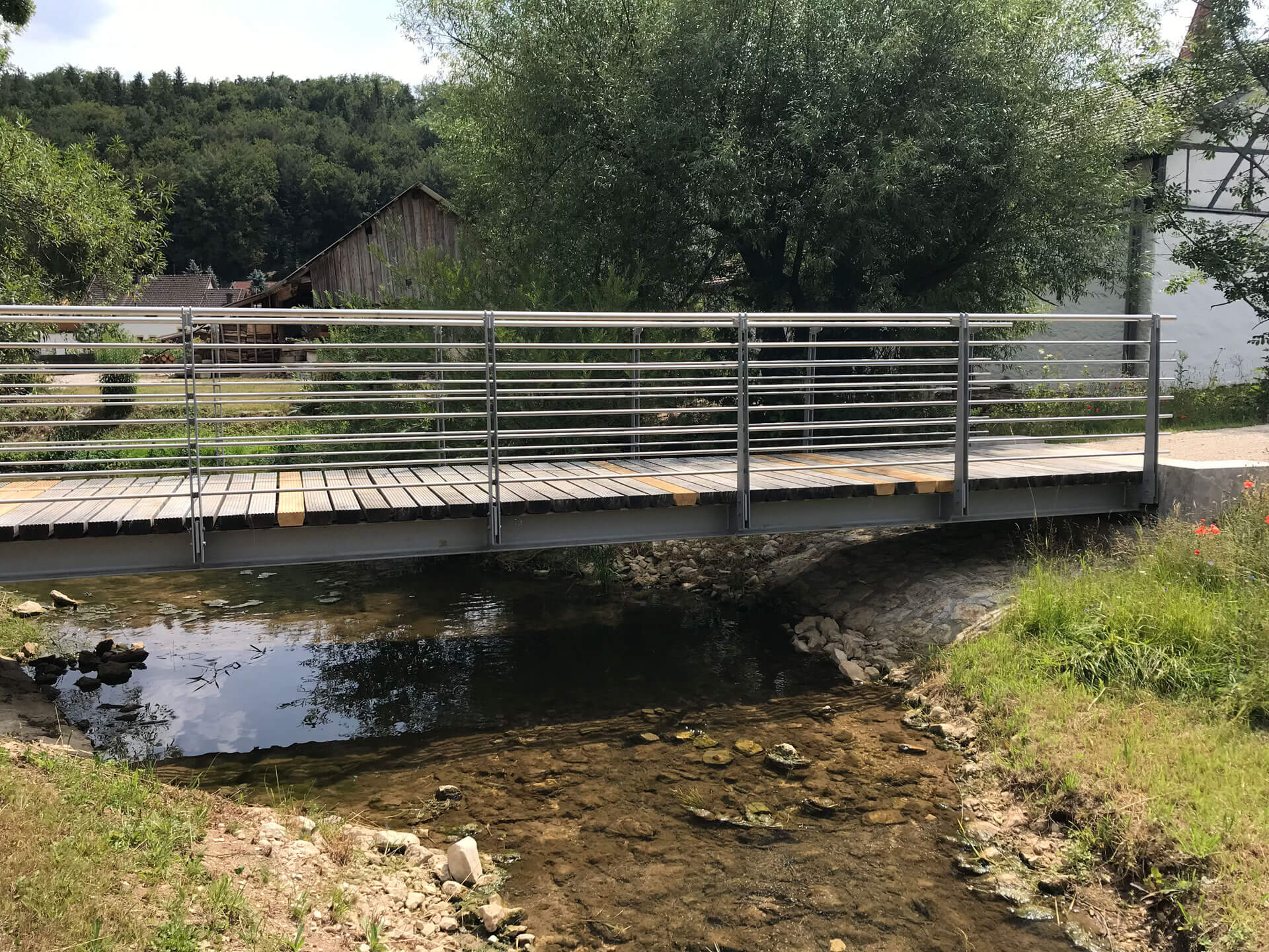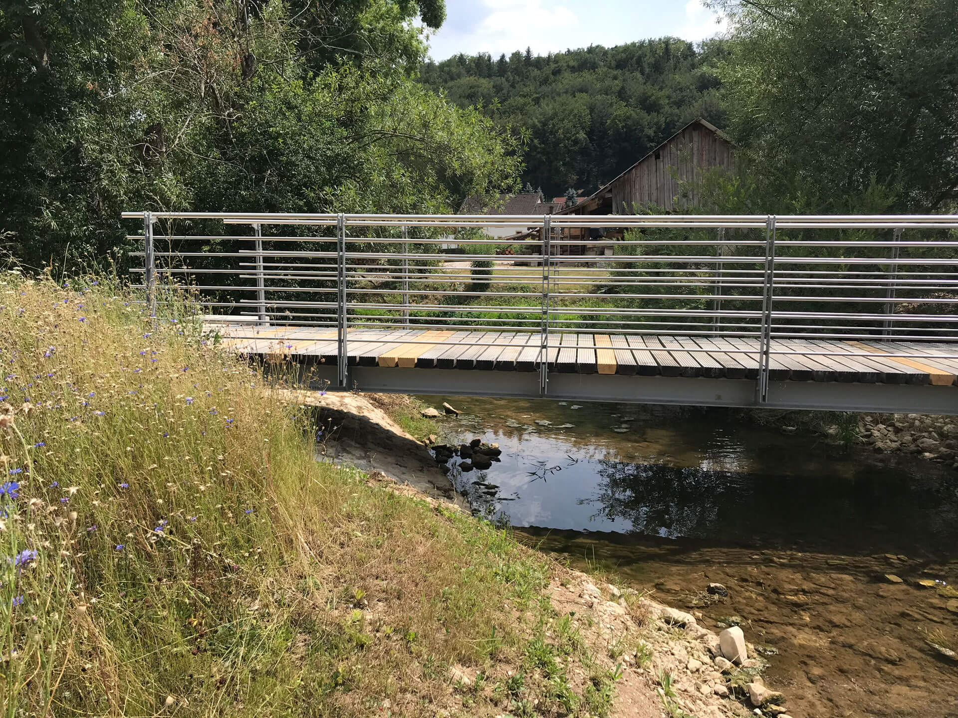 Um Einheimischen und Touristen einen guten Zugang zu ermöglichen, errichtete MTS zwei Fußgängerbrücken über den Altarm und den Werkkanal des Flüsschens Anlauter. Beide Bauwerke mit Spannweiten von acht und zehn Metern bestehen aus einem überhöhten Stahlprofiltragwerk mit Edelstahlgeländer. Beide Brücken wurden inklusive Massiveichendielen komplett von MTS gefertigt, vormontiert und in einem Hub auf der Baustelle eingehoben.