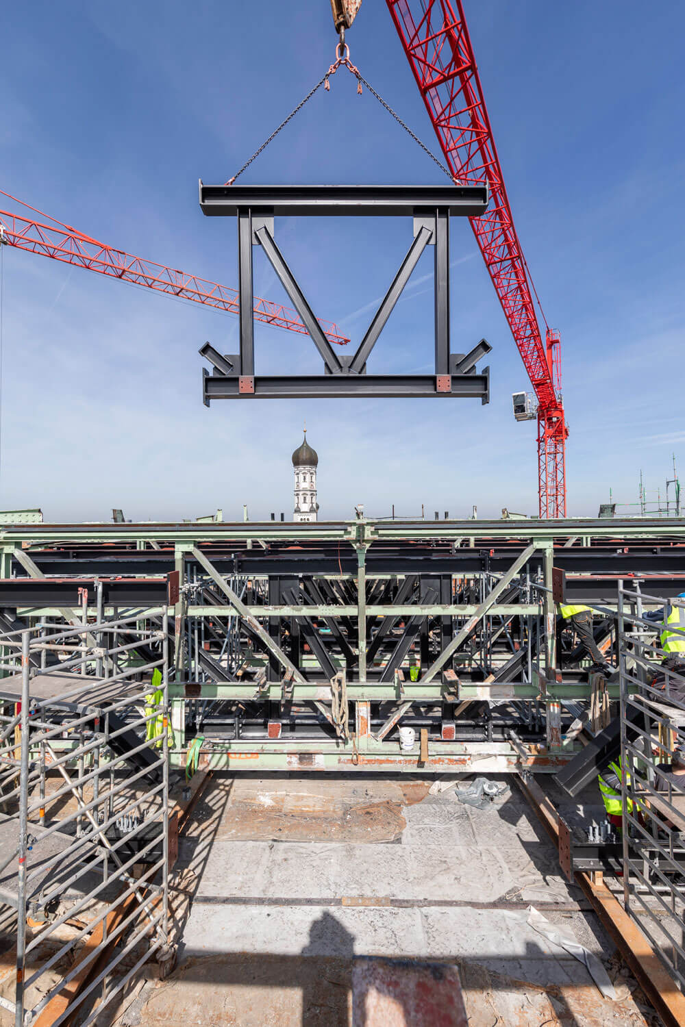 Die Besonderheiten bei diesem Projekt waren die Randbedingungen. So wurden die vier Türme bei vorhandenem Dach und ohne Baukran montiert. Der Transport erfolgte mit einer Rollbahn durch eine Fensteröffnung und anschließend mit einem Kettenfahrwerk an den richtigen Einsatzort. Mittels einer eigen konzipierten Krananlage wurden die 172 Tonnen Stahl im Inneren zu den vier Türmen aufgebaut.
