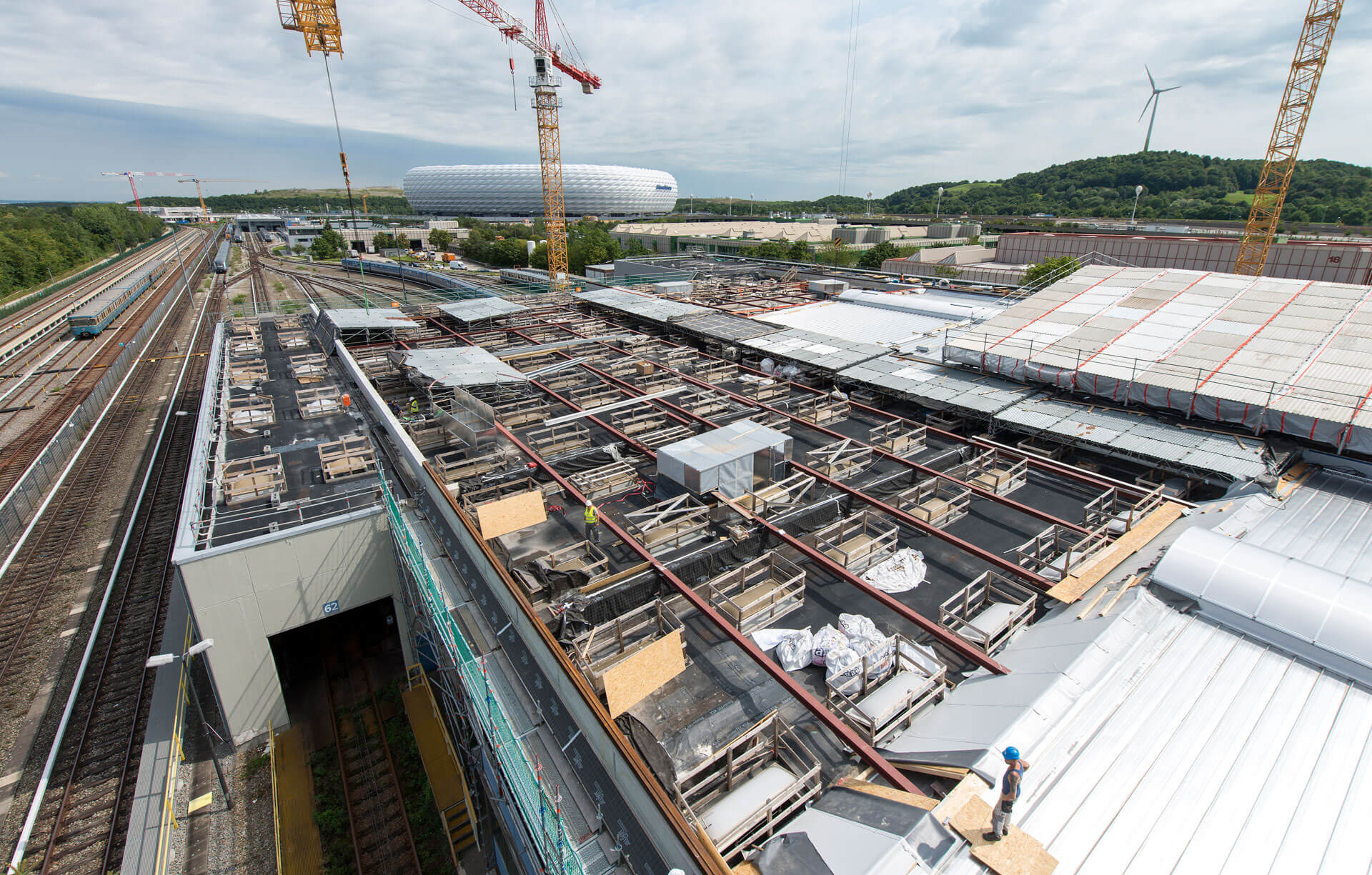 Das Gebäude 11 im Hans-Jensen-Weg München-Fröttmaning stammt noch aus den 1970er Jahren. In unmittelbarer Nachbarschaft zur Allianz Arena dient es als Werkstatt und Wartungshalle für U-Bahnen.