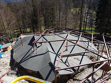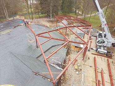 Unsere Fachleute fertigten und montierten zu diesem Zweck eine robuste Stahlkonstruktion, mit der besonderen Herausforderung, die Baustelle über unbefestigte Forststraßen zu beliefern.